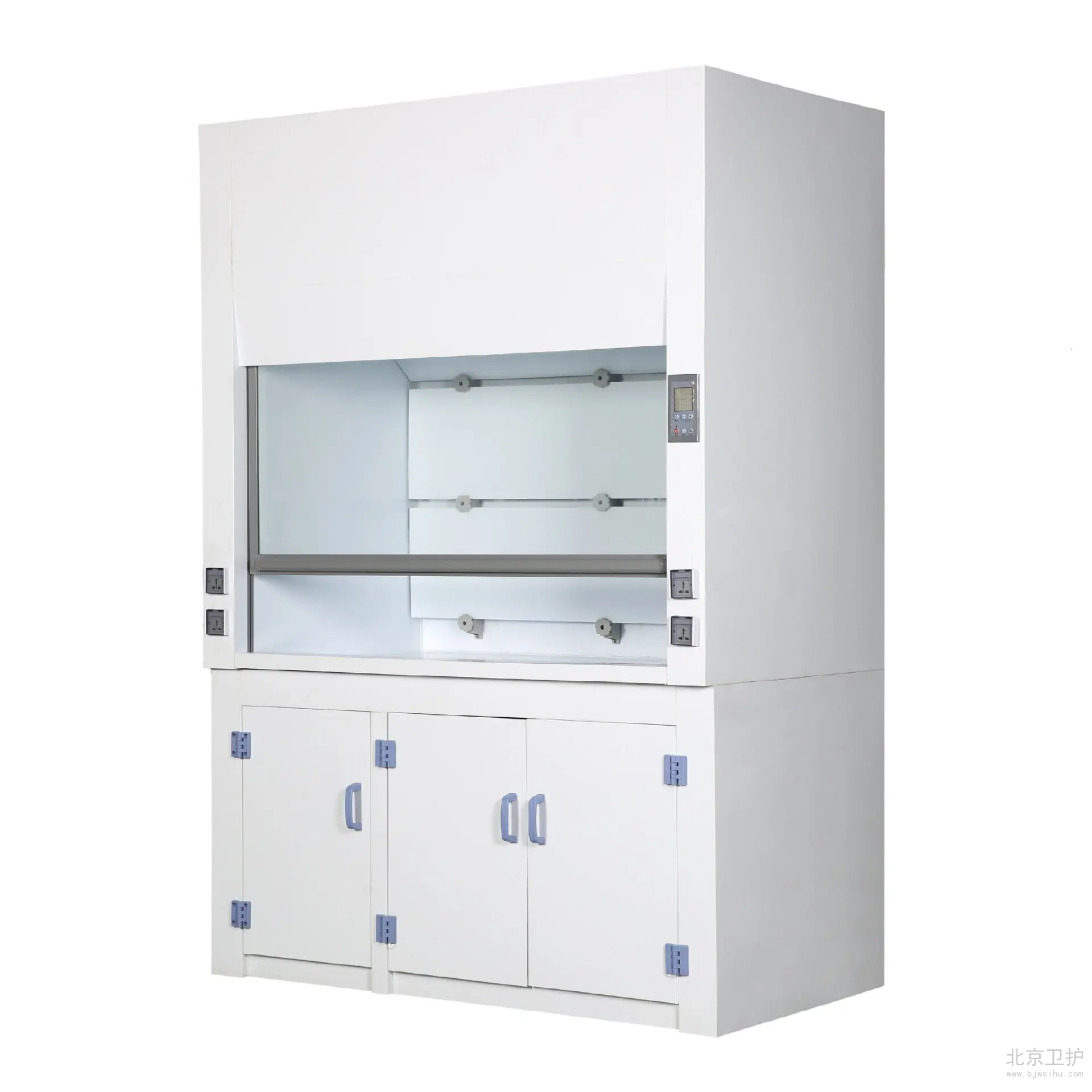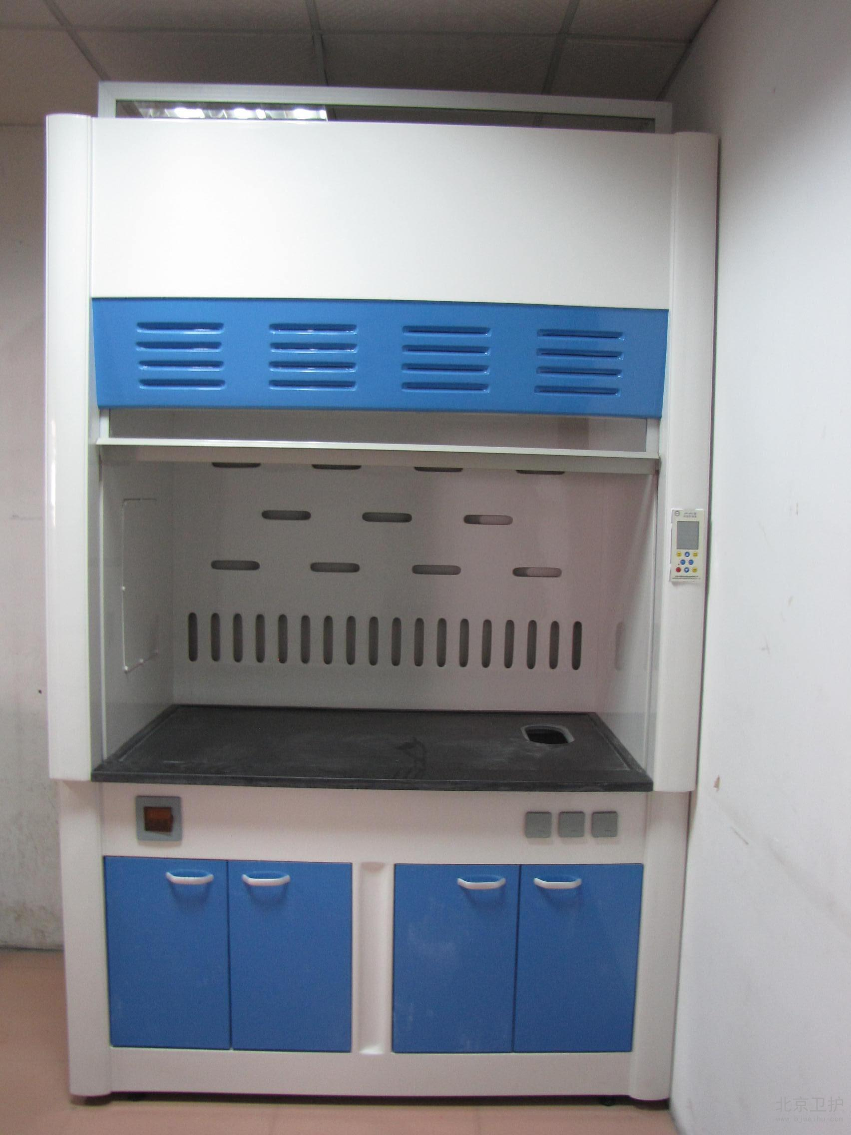 通風柜是實驗室家具中必不可少的一種。在實驗室中起到排風和換氣的功效。通風柜的結構是上下式,其頂部有排氣孔,可安裝風機。上柜中有導流板,電路控制觸摸開關,電源插座等 ,透視窗采用鋼化玻璃,可左右或上下移動。供人操作。下柜采用實驗邊臺樣式,上面有臺面,下面是柜體。臺面可安裝小水杯和龍頭。通風柜的材料由多種的,全鋼、鋼木、全木、鋁木、塑鋼、PVC結構等,其臺面是直接與操作者接觸的地方,由實芯理化板,不銹鋼板,PVC,陶瓷等材料組成。舊式通風柜多用木材制成,但現代多為涂有環氧樹脂的鋼材制造。常見柜寬為1000、1200、1500、1800和2000毫米幾個規格,深700-900毫米,高1900-2400毫米。可供1-3個人同時使用。 通風柜一般靠墻安裝。前方中間為可上下移動的透明門(多為玻璃),開啟高度一般為100-600毫米。門后為實驗進行的工作面,有水管、下水道、電源、真空泵、氣路管線等實驗需要的連接,上有帶保護罩的燈照明??諝庥晒駜惹吧戏降呐棚L扇抽走后,或經管道引到別處(稱為全通風),或經過濾重新循環使用(成為無管通風)。多數通風柜在(1)排氣量過小(2)前方玻璃門開啟過大的時候會發出警報,提醒操作者注意,一般玻璃門開啟后操作口風速不應低于0.5m/s,內部的排風扇速度和燈都有開關可調。使用的時候人站或坐于柜前,將玻璃門盡量放低,手通過門下伸進柜內進行實驗。由于排風扇通過開啟的門向內抽氣,在正常情況下有害氣體不會大量溢出。